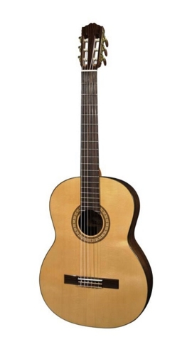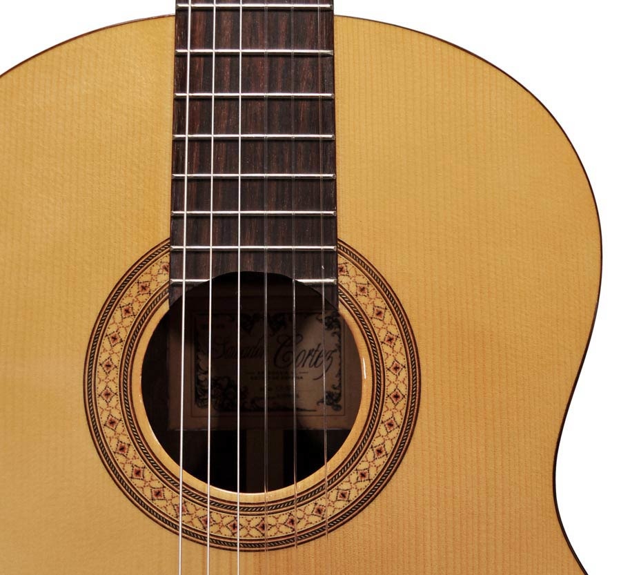Salvador Cortez CS-50 med Grandæk Top - Klassisk guitar med massiv grandæk top, rosentræ bagside og sider. Saddel og stoleindlæg i ben, kvalitets mekanikker, træ kantbindinger på top og bagside samt lakeret stol med ahornsindlæg.