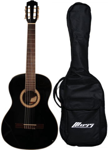 Flot og velspillende spansk akustisk guitar fra Moss. Guitaren er i en flot højpoleret sort farve med Gran dæk og mahogni sider og bagside. Guitaren et rigtig godt valg til guitaristen som vil have en rigtig fin guitar at starte på. Guitaren er i en kvalitet så den kan bruges i flere år efter man er blevet øvet. Alt dette til en pris under dkk 1000,-