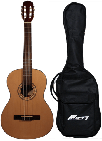 Flot og velspillende spansk akustisk guitar fra Moss. Guitaren er med Gran dæk og mahogni sider og bagside. Guitaren et rigtig godt valg til guitaristen som vil have en rigtig fin guitar at starte på. Modellen er i en kvalitet så den kan bruges i flere år efter man er blevet øvet.