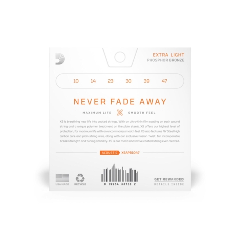 D´Addario - XSAPB1047 - Western 10-47 - Coatede strenge til Western guitar i Phosphor Bronze 10-47, Extra Light. Strengene er behandlet med en ultra tynd coating på de omspundne bas strenge og en unik polymer behandling på de tynde strenge (diskant strengene). XS tilbyder et højt beskyttelses-niveau imod rust og snavs på strengene og giver en "smooth" følelse.