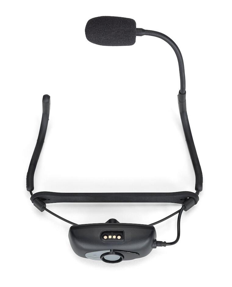 - Micro transmitter mounted directly to a double ear headset (no beltpack or cable required)