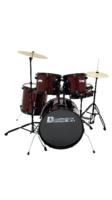- Komplet med 3 trommer, bækken, trommestol, stativer, stortrommepedal og stikker