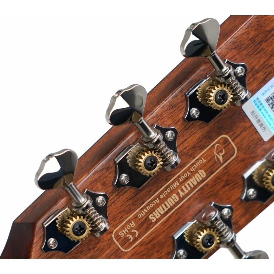TG-10E er bygget med massivt sitka grandæk, sadel og bro i ben, og en flot højglans lakering. Bund og sider er udført i mahogni, mens dækket er konstrueret med det Double-V spande design, som vi omtalte ovenover. Western-guitaren udmærker sig ved sit massive Sitka grandæk. Sitka gran udmærker sig ved sit flotte udseende, og en særdeles overtonerig og balanceret klang, som egner sig lige godt til fingerspil, akkord eller solo spil. På TG-10E har Tyma valgt at udføre guitaren i en klassisk Grand Auditorium størrelse, hvilket betyder at guitaren er en smule mindre end en dreadnought. Dette gør den velegnet til dem, som synes at en dreadnought er lidt for voldsom i størrelsen, eller dem der står meget op, når de spiller guitar. Grand Auditorium modellen er desuden lidt mere fokuseret i mellemtonen, hvilket gør den ekstra velegnet til fingerspil.