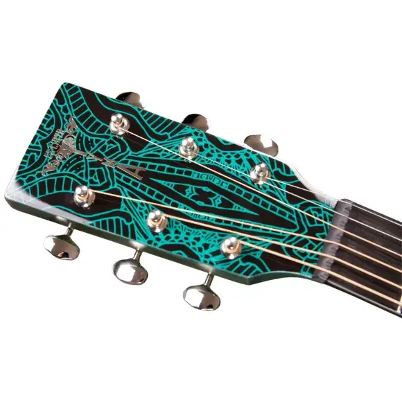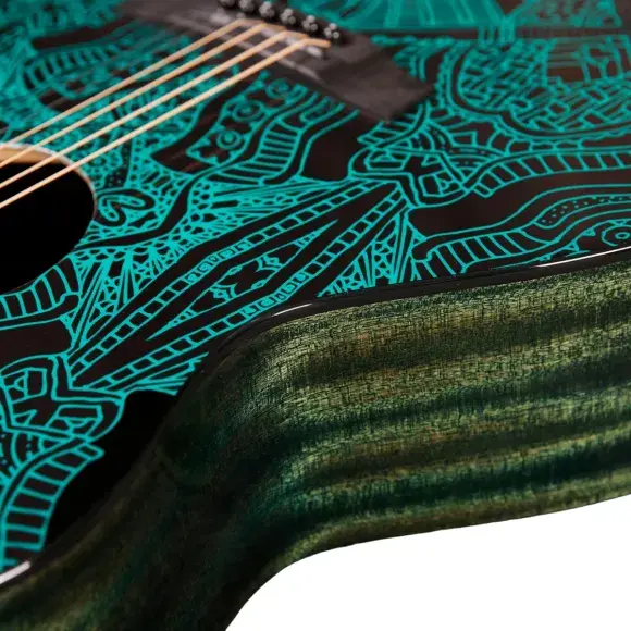 Det unikke tribal-mønster, der dækker guitarens top under en blank lakering, giver instrumentet et iøjnefaldende og moderne look. Samtidig er guitarens form og vægtbalancerede konstruktion ideel til både siddende og stående spil.